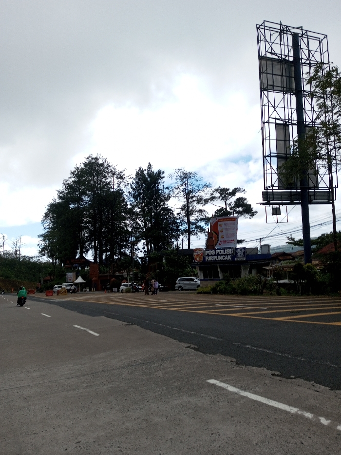 The image captures a roadside scene, identified by visible signage as "POS POLISI PJR PUNCAK," which indicates a location in Indonesia, not Phoxay, Laos. The foreground consists of a grey concrete road with a darker asphalt section featuring yellow hatched road markings, potentially a pedestrian crossing. White dashed lines are present on both road surfaces. A single individual wearing a green top is visible riding a dark-colored motorcycle from right to left on the concrete road. To the right of the road, a paved area hosts several parked vehicles, including multiple light-colored cars. A group of approximately five to seven individuals, appearing as pedestrians, are gathered near these parked cars. Behind them stands a building labeled "POS POLISI PJR PUNCAK" (Police Traffic Post PJR Puncak), suggesting it is a police station or outpost. Above this building, a large vertical banner advertisement, primarily red and white, is displayed. The midground is dominated by a cluster of tall, slender evergreen trees, interspersed between the paved area and distant features. On the far right, a very large, empty metal billboard structure with multiple horizontal and vertical support beams is prominently featured, rising high above the surrounding landscape. The background on the left shows distant hills or mountainous terrain. The sky is largely overcast with patches of lighter cloud cover.