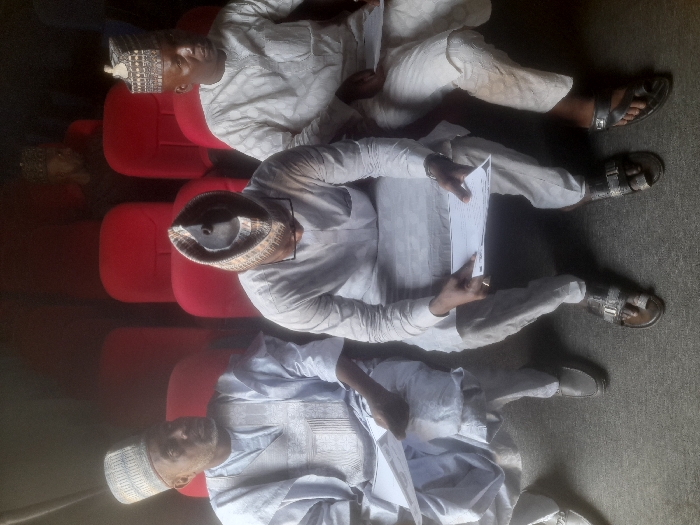 Three men, dressed in white robes and wearing hats, are seated in a row. The two men on the ends are looking at the viewer, while the man in the middle is looking down at a white paper in his hands. All three men are seated on red seats. The scene appears to be a meeting or a formal gathering, possibly in a public space or a hall. The coordinates provided suggest the location is in Gusau, Nigeria.