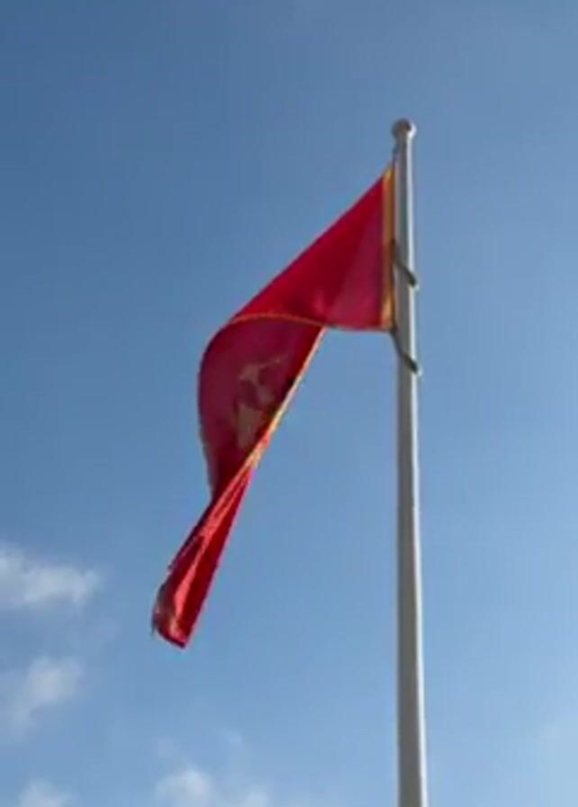 A red flag with a golden emblem in the center flutters in the wind against a clear blue sky