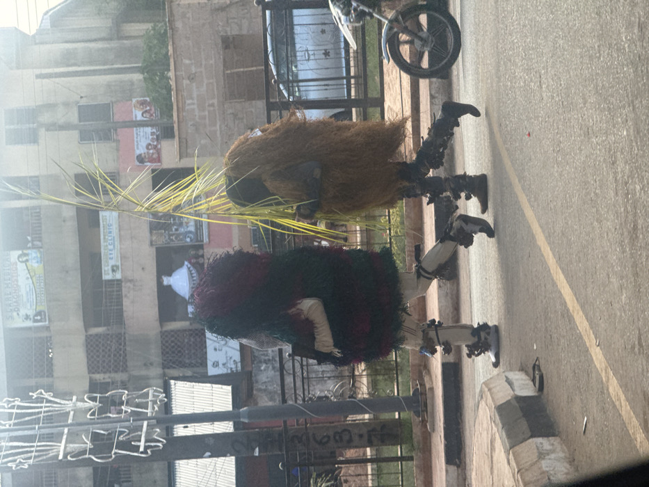 - "Two individuals in elaborate, traditional-style costumes are depicted walking from left to right across a paved road in Ekwulobia, Nigeria, during daylight hours" by FM-8VDrP2, licensed under CC BY 4.0