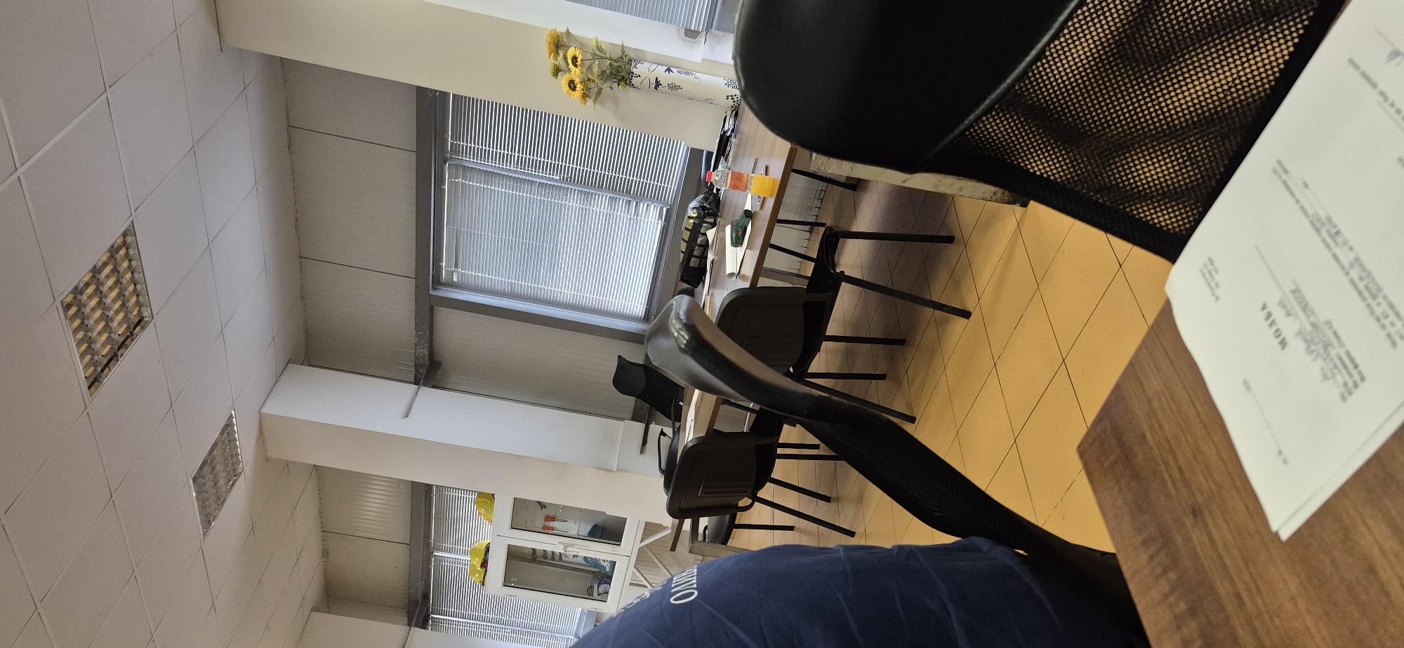 The scene depicts an indoor office or meeting room located in Polski Trambesh, Bulgaria. The perspective is from a seated position, looking across a dark brown wooden table. In the immediate foreground, a stack of white papers rests on the table, with the top document displaying the Bulgarian word "МОЛБА" (Application/Request). A portion of a black mesh chair back is visible to the right. To the left, the shoulder and back of an individual wearing a blue garment with partial white lettering ('ОАЛ...') is visible. The mid-ground features a long, dark brown wooden table, surrounded by several black chairs with dark gray seats and backs. On this table, a transparent plastic bottle containing an orange liquid with a red cap is present, along with a small green handheld power tool (possibly a drill or screwdriver). The background reveals an interior with a light yellow-orange tiled floor. The walls feature light-colored paneling in the upper section and a painted lower section. Multiple windows fitted with closed horizontal blinds admit natural light. Two prominent white structural pillars divide the space. To the left, a white cabinet with glass doors contains various items, and two yellow hard hats are placed on its top surface. To the right, a tall white vase with blue floral patterns holds artificial yellow sunflowers near a window. The ceiling is a white tiled false ceiling, equipped with two recessed rectangular fluorescent light fixtures featuring gridded diffusers. The overall environment suggests an administrative or operational workspace.