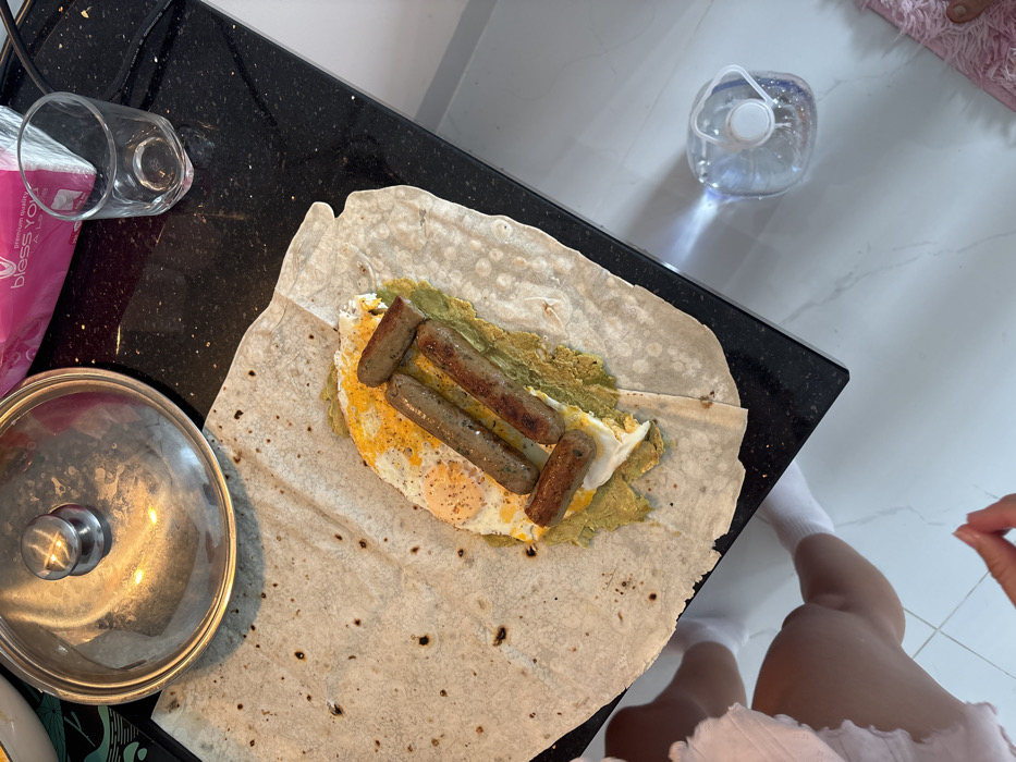 A tortilla lies on a black countertop. Atop the tortilla are eggs and sausages, possibly arranged as filling for a wrap. A glass and a pink package are on the side of the counter. A lid is present near the tortilla. A water bottle is positioned near the edge of the counter. A person, partially visible, stands next to the countertop, wearing white socks and a pink garment. The countertop appears to be in a kitchen or dining area.