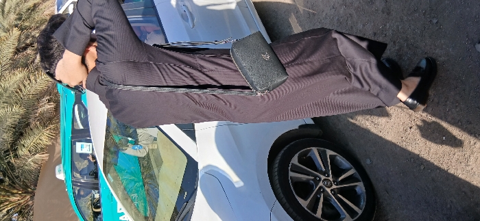 The image depicts an outdoor scene in Medina, Saudi Arabia, indicated by the word "أحد" (Uhud) on a taxi's windshield, a local landmark. A person, presumed male, stands with their back largely to the camera, angled slightly right, on an unpaved, sandy-gravel surface under bright sunlight. They are wearing a long, dark (black or dark grey) thobe/abaya and black loafers. A black, rectangular cross-body bag with a metallic emblem is worn over their right shoulder. The person's right hand is raised to the back of their head, appearing to adjust sunglasses perched on their head or their hair. To their left and slightly behind, a white Hyundai Elantra sedan is partially visible. Behind the white car, a light blue/teal taxi with a white roof-mounted sign and Arabic script is present. The background features palm trees and what appears to be a sandy dune or hill under a clear sky.
