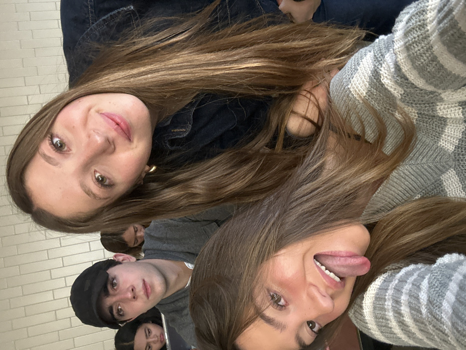 The image captures an indoor scene featuring five young individuals, likely in a classroom or lecture hall located in Interlomas, Mexico. In the immediate foreground, a female with light brown hair, wearing a grey and white striped sweater, looks directly at the camera with her tongue extended playfully. Positioned slightly behind and to the right of her, a second female with long light brown hair, wearing a dark denim jacket and gold hoop earrings, smiles subtly towards the camera. In the mid-ground, a male wearing a black baseball cap and a grey hooded sweatshirt maintains a neutral expression, looking forward. Behind him, to the far left, a fourth female with dark hair is partially visible, looking downwards with a serious expression. The top of a fifth individual's head is partially visible in the far background. The environment consists of a light-colored, tiled or bricked wall with a horizontal white trim line, characteristic of an institutional setting.