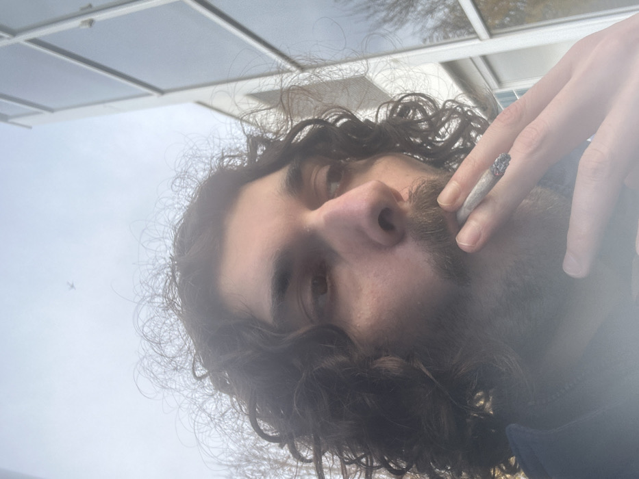A male individual with dark, curly, shoulder-length hair and a beard/mustache is depicted in an outdoor setting in Chatou, France. He is wearing a dark garment, possibly a jacket, visible around his neck. The man is holding a lit, hand-rolled cigarette between the index and middle fingers of his right hand, positioned at his mouth, and appears to be in the act of smoking or exhaling. His gaze is directed towards the upper right, away from the camera. The background reveals a light, overcast sky. In the upper left quadrant, a small, dark object consistent with an aircraft is visible against the sky. To the right of the individual, a modern building with large, rectangular windows reflects the sky and bare tree branches. Additional bare trees are visible in the background on the left side of the frame. The overall lighting suggests daylight.
