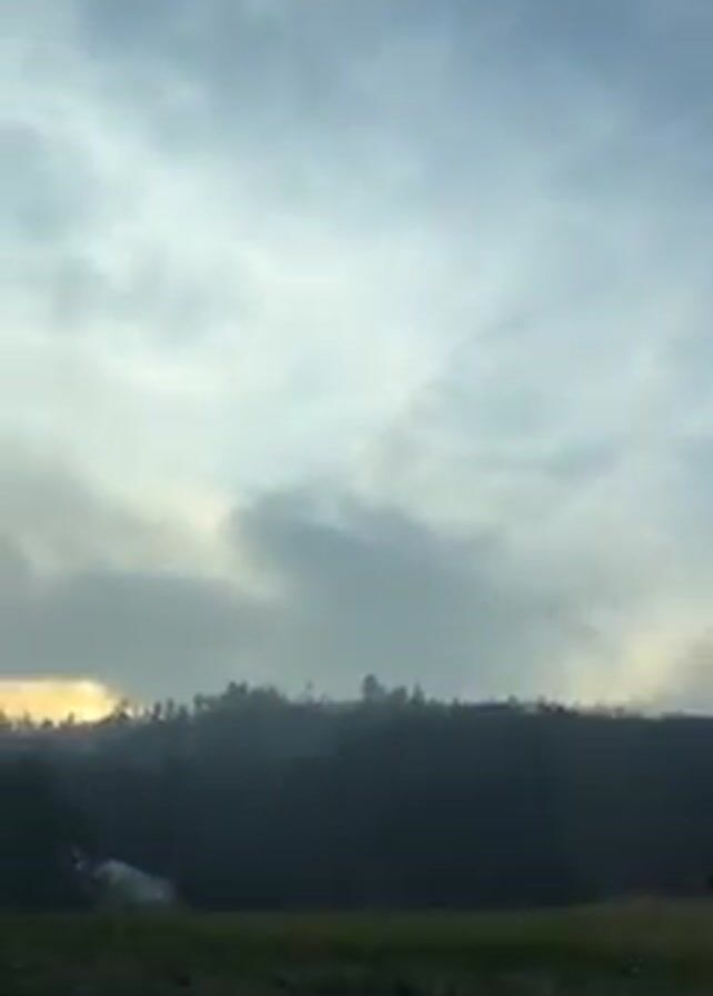 view from a car window while driving on a highway. The sky is overcast with patches of blue. Initially, a vineyard lines the roadside. As the car moves, the view shifts to a forested area in the distance, where the sun appears to be breaking through the trees. A road sign indicating a sharp turn is briefly visible. Later, a house is seen through the window.