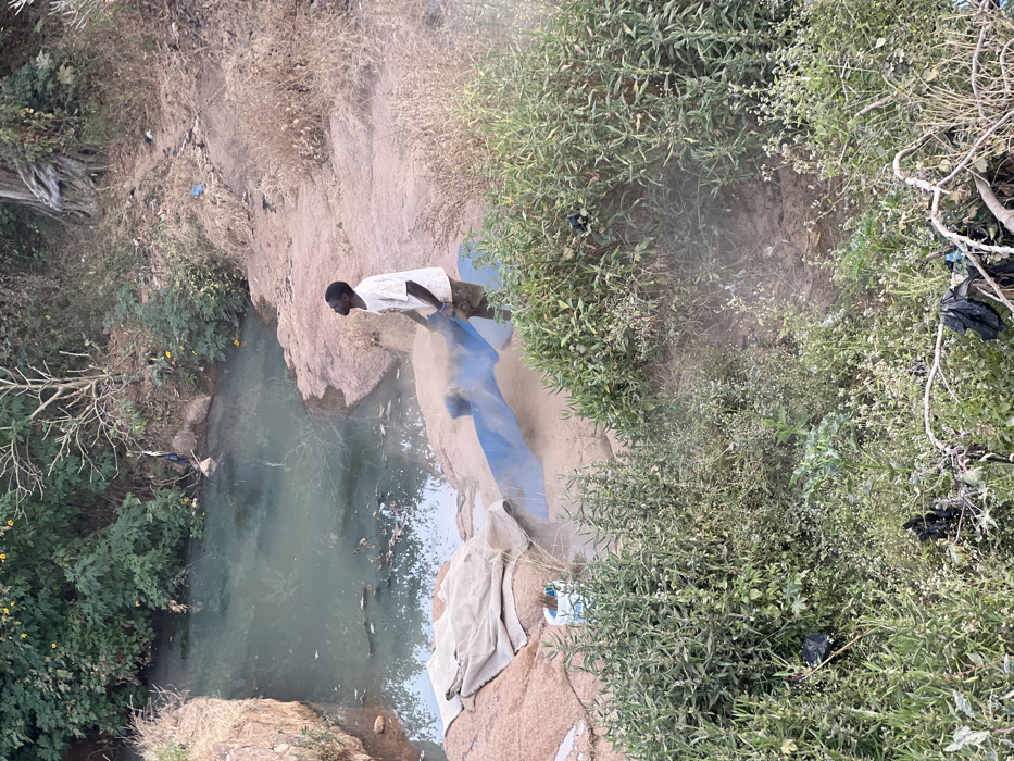 A man in a white shirt stands on a sandy bank overlooking a narrow, murky river