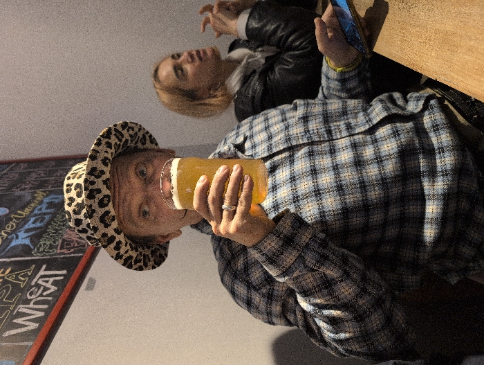 A man in a leopard-print hat drinks from a glass of beer. He wears a blue and white plaid shirt. Behind him, a woman in a leather jacket has her hand raised. Another arm holds a phone, resting on a wooden surface. A chalkboard with writing in chalk is visible.
