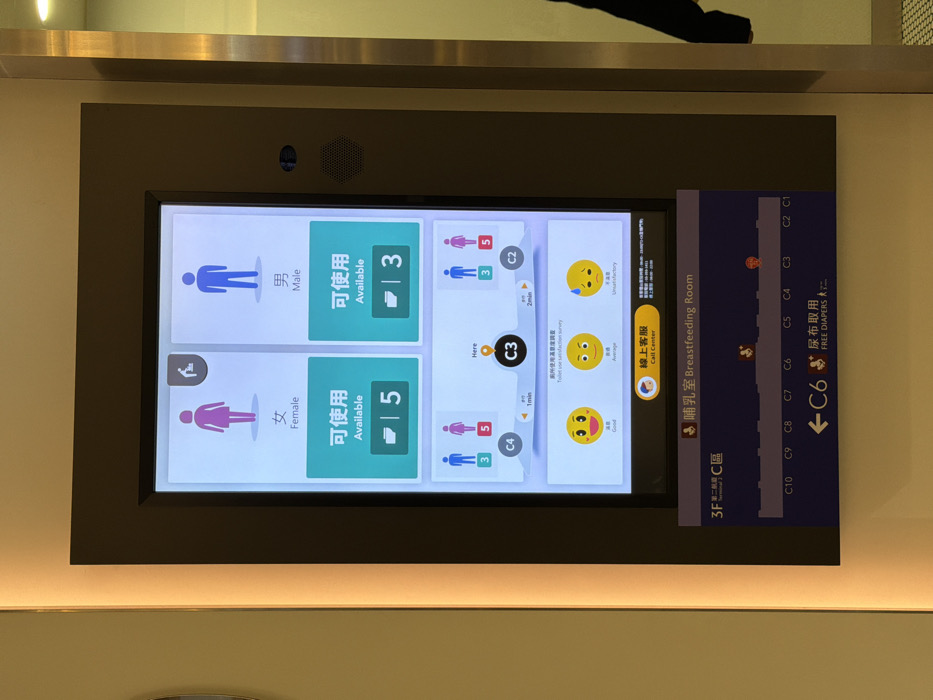 A digital information display is presented vertically within a dark frame, mounted on a wall in an indoor public space, specifically on the 3rd Floor of Terminal 2 at Taiwan Taoyuan International Airport in Taoyuan City, Taiwan. The screen displays real-time public restroom availability: "Female" shows 5 "Available" stalls, and "Male" shows 3 "Available" stalls, alongside an accessible toilet icon. Below this, a map section indicates the current location as "C3 Here," with nearby restrooms at "C4" (1 minute away, showing 3 male, 5 female available) and "C2" (2 minutes away, showing 3 male, 5 female available). A "Toilet use satisfaction survey" section features "Good," "Average," and "Unsatisfactory" emoji options. A "Call Center" button is also visible. The bottom section of the display presents a facility map, labeling "3F Terminal 2 C區" and indicating a "Breastfeeding Room" and "FREE DIAPERS" available at "C6," with other gates (C1-C10) marked. A subtle vertical light strip illuminates the left side of the display frame. A speaker grille is integrated into the right side of the screen's frame. A person wearing dark clothing is partially visible on the far right edge of the image.