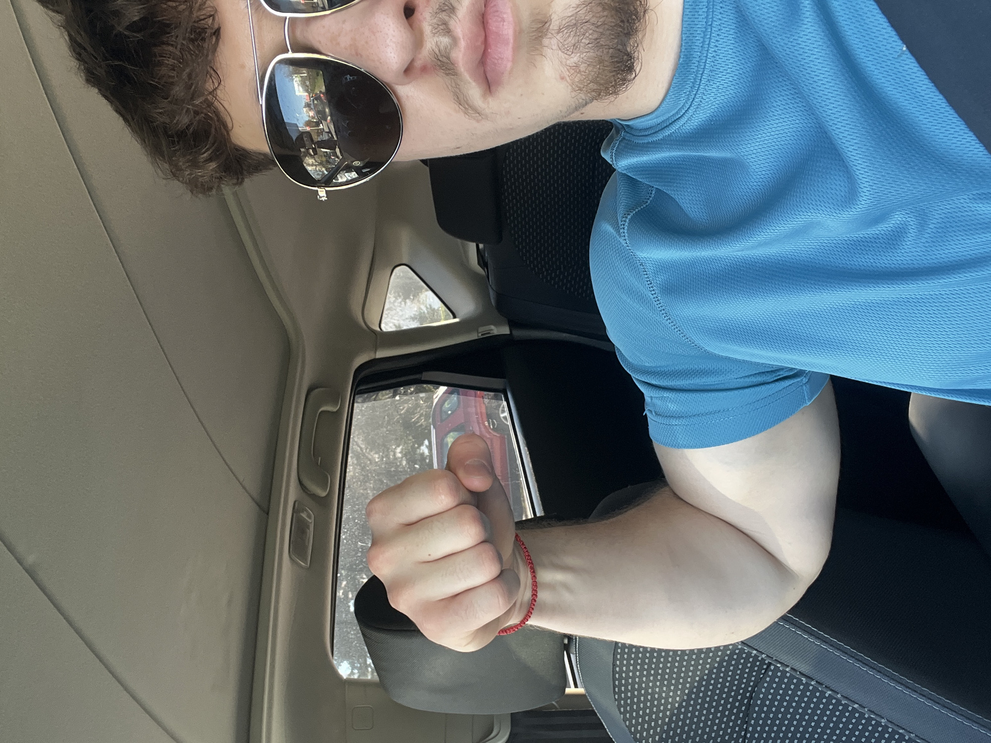 A person is in the driver's seat of a car. The person is wearing sunglasses and a blue shirt. The person's left fist is clenched. A red string bracelet is visible on the person's left wrist. The car is in a location within Plovdiv, Bulgaria as reflected in the sunglasses lenses. The car is parked or stopped near a street. A red car is visible outside the window. The interior of the car is visible, including the seats and headrests.