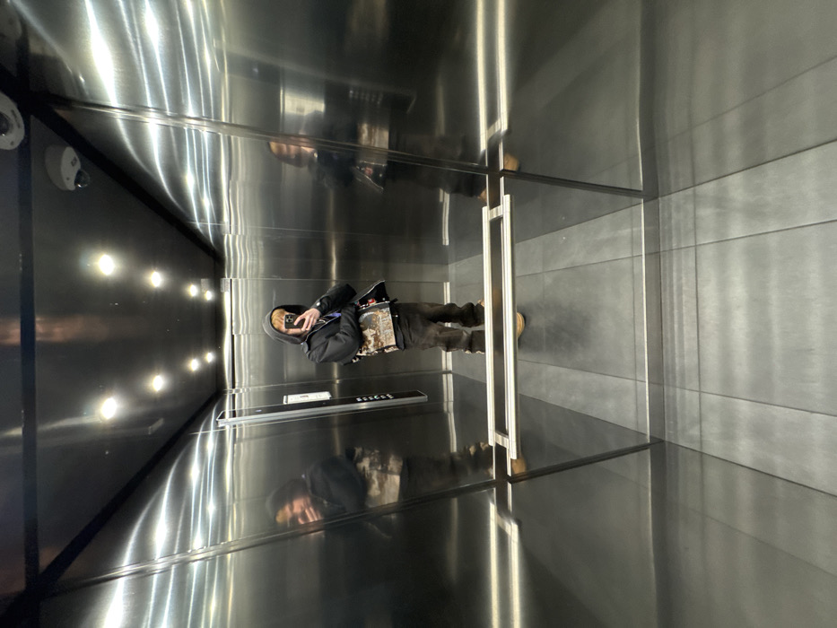 The image displays a single individual taking a mirror selfie inside a modern elevator