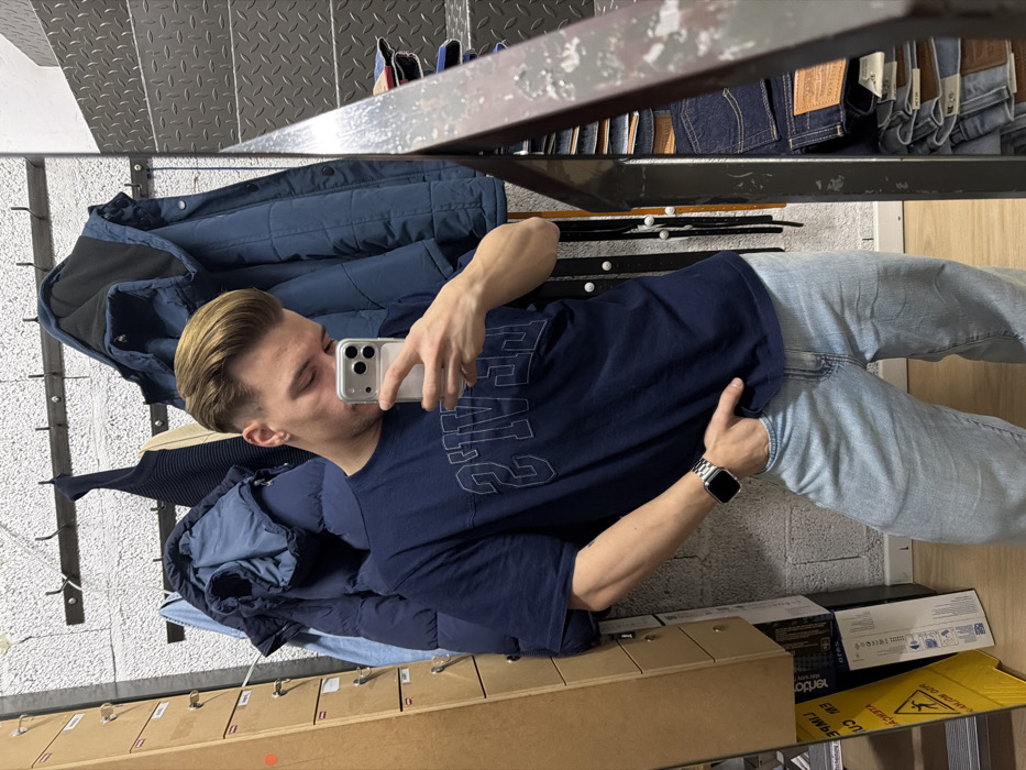 A male individual is depicted in a mirror selfie within what appears to be a retail or storage area in Viseu, Portugal. The man, with light-colored, swept-back hair and a light complexion, wears a navy blue t-shirt featuring the word "LEVI'S" in reverse outline font, light-wash denim jeans, and a silver-toned smartwatch on his left wrist. He holds a silver-cased smartphone with a triple-lens camera array in his right hand, positioned to capture his reflection. His left hand is placed inside his left jeans pocket. The background, largely visible through the mirror's reflection, includes a textured light gray wall with a horizontal metal rail from which several garments hang: a dark blue puffer jacket, a dark ribbed sweater, and another dark blue jacket. Below these, multiple dark belts hang vertically against the wall. To the left, a tall, narrow, light brown wooden storage unit with multiple compartments is partially visible, and a yellow "wet floor" warning sign is present on the floor below it. To the right, a dark gray metal staircase with a diamond plate texture and a metal handrail is reflected, below which a stack of folded denim jeans is visible.