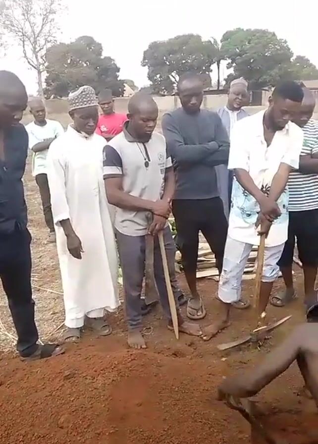 A group of men stand around a rectangular hole in the ground, some holding tools, others with their hands at their sides, while one man digs in the hole. Some of the men are wearing casual clothing, including shirts, pants, shorts, and hats, while one man wears a white religious robe and hat. The ground is red dirt. There are a few trees in the background. One man is holding and filming with a smartphone.
