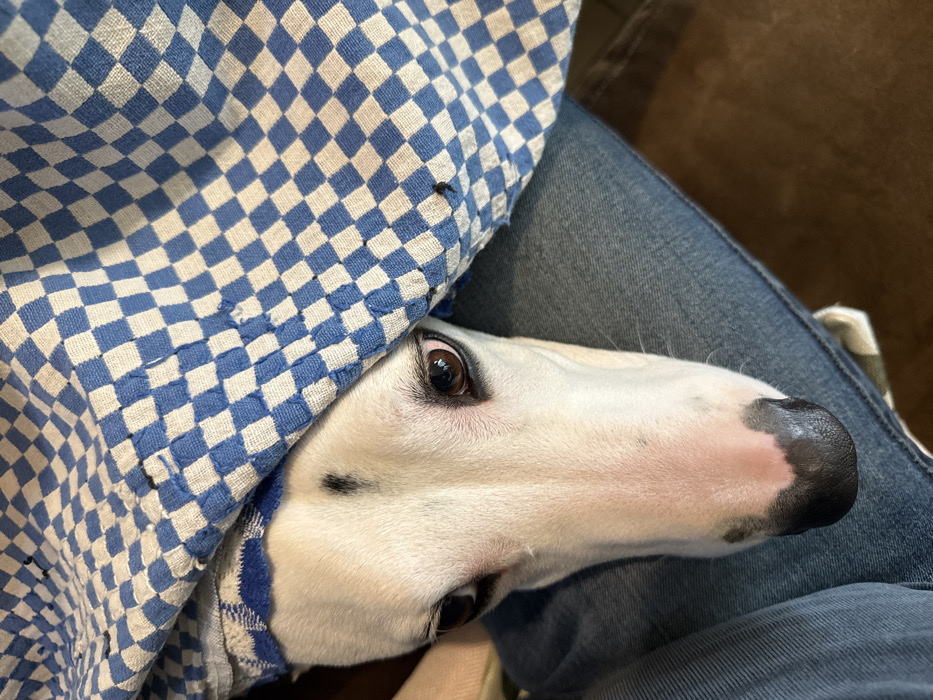 - "A white dog with a black nose is tucked beneath a blue and white checkered cloth" by FM-rjc8l1, licensed under CC BY 4.0