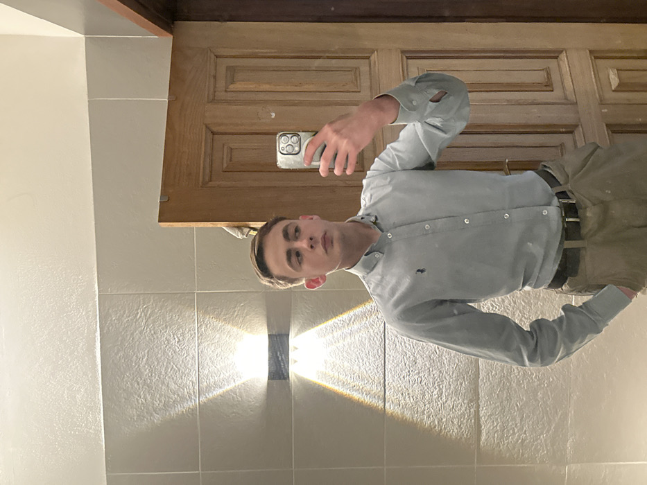 A young Caucasian male, approximately 18-25 years of age, with short light brown hair, is depicted indoors, ostensibly taking a mirror selfie. He wears a light grey long-sleeved button-down shirt with a dark embroidered emblem on the left chest, light brown trousers, and a dark belt. His right hand holds a smartphone, displaying a multi-lens camera array, positioned to capture his reflection. His left hand is placed in his trouser pocket. The background reveals textured, light-colored rectangular wall tiles. On the left, a dark-colored wall-mounted light fixture emits distinct upward and downward conical light patterns onto the tiled surface. To the right, a light-colored wooden door with recessed paneling is visible, with a light-colored cloth hanging near its frame. The specific location within Vila Real, Portugal, cannot be determined from the visual information provided.