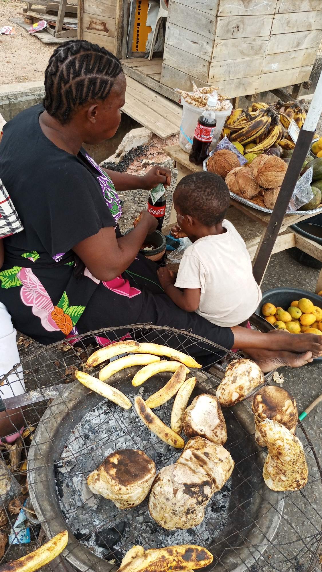 In Zango-ndaji, Nigeria, an adult woman with braided hair sits on the ground with a young child. She wears a black dress with floral patterns. The child is seated beside her, wearing a white shirt. They are next to a charcoal grill with cooking plantains and yam. The woman holds a bottle of Coca-Cola. Next to her is a wooden platform filled with coconuts, plantains, and mangoes. A bowl of oranges is nearby. The setting appears to be an outdoor market or street-side food stall.