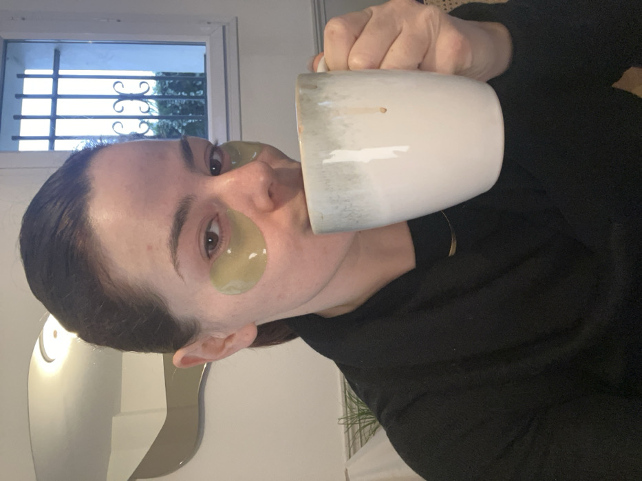 A female subject is depicted indoors, likely within a residence in Rueil-Malmaison, France. She has dark hair pulled back, wears a black top with a thin gold necklace, and has two translucent, gold-hued gel eye patches applied beneath her eyes. The subject is looking directly at the camera while raising a white ceramic mug, featuring a light green rim and a brown drip on its side, to her mouth, indicating consumption. Her right hand grasps the mug. Behind the subject's left shoulder, an irregularly shaped mirror reflects a circular ceiling light fixture. Behind her right shoulder, a white-framed window is visible, fitted with ornate black security bars. Blurred green foliage is discernible through the window. A green plant is partially visible in the lower left background.