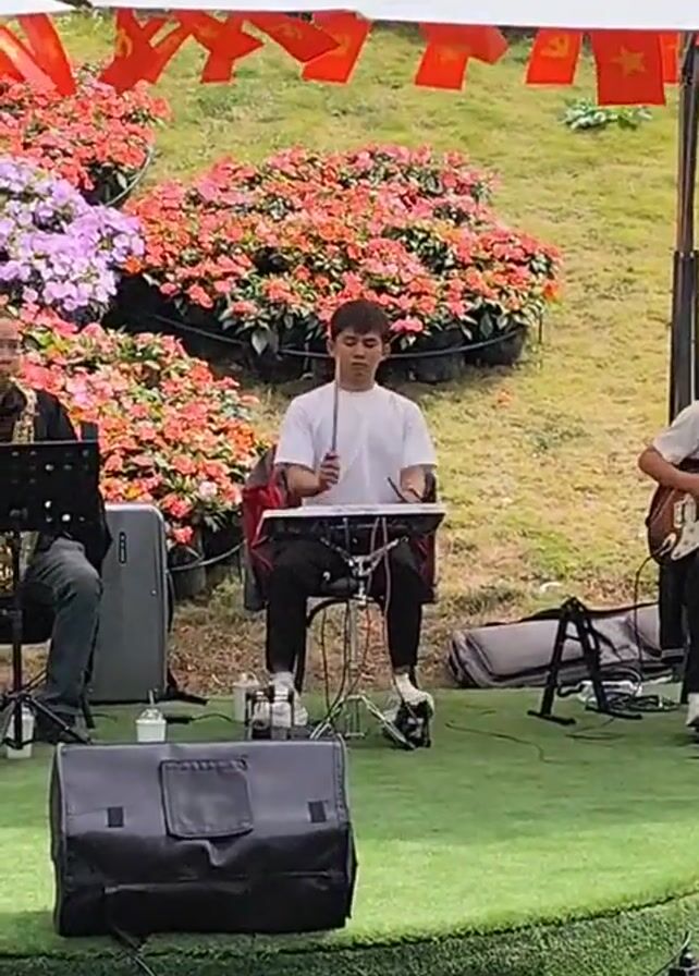 A musical trio performs outdoors on a patch of artificial grass. A man plays the saxophone, another plays electronic drums, and the third plays a bass guitar. Vietnamese flags are strung overhead, and beds of colorful flowers create a vibrant backdrop. White umbrellas offer shade. Amplifiers and other equipment are strategically placed. The scene suggests a live music event or performance.