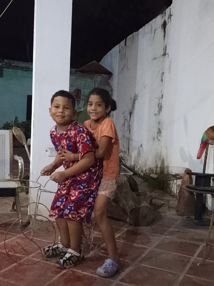 - "Two smiling children stand next to a decorative metal bicycle on a brick-tiled patio" by FM-SrAiG2, licensed under CC BY 4.0