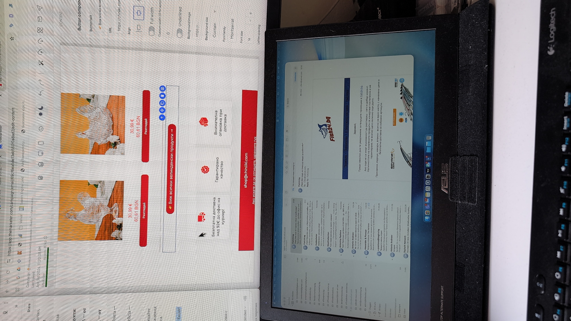laptop screen displaying two different interfaces. On the left, a web page open in a browser is visible, featuring an advertisement for decorative glass chickens, priced at 30.99 euros (60.61 BGN). Calls to action include "Разгледай" (Browse) and "Виж всички великденски продукти" (See all Easter products). Text promoting free delivery for orders over 92 euros to a courier office is displayed. On the right side of the screen, a Microsoft Outlook email interface is open, displaying a list of emails from various senders, including "Fish24.bg." The environment is somewhat cluttered, with a Logitech keyboard visible on the right side of the laptop. The laptop itself is an ASUS model, judging from the visible logo. The image does not provide enough information to know if it is Oreshak, Bulgaria.