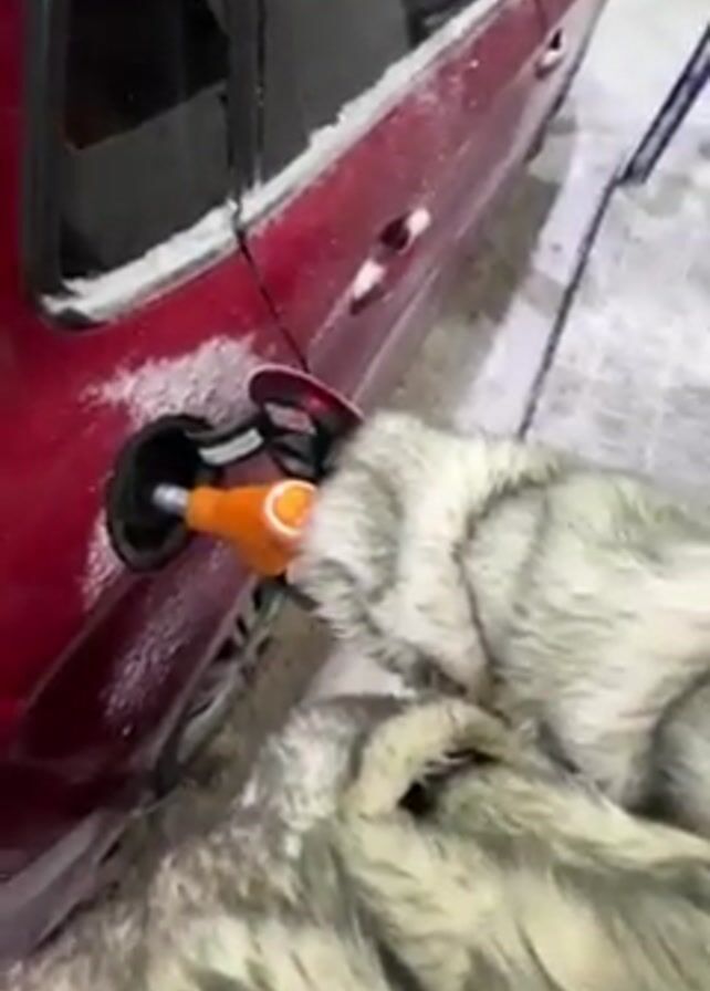 person filling a red car with gas at a gas station. The ground is covered in snow. The person is wearing a furry, gray and white jacket. The person is holding the gas pump nozzle and inserting it into the car's fuel tank. There is a gas station canopy overhead and other lights can be seen in the distance.