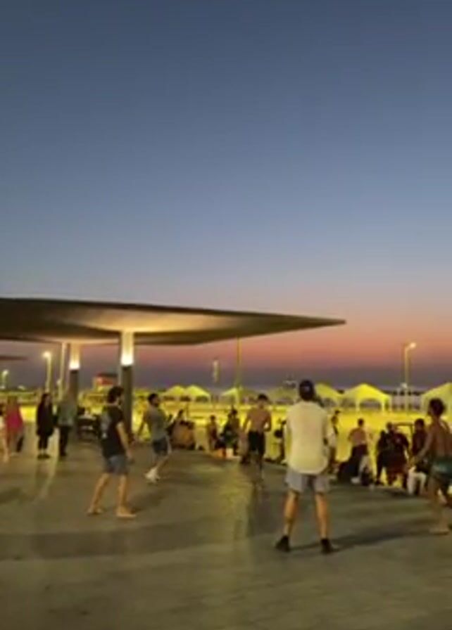 The video captures a group of young adults playing a game, possibly using a small ball or a similar object. The scene takes place on a paved area next to a beach at dusk. The sky transitions from blue to hues of pink and orange. People are sitting or standing on the beach in the background. A modern, flat-roofed structure provides shade and is illuminated with lights. The players are dressed casually, and others are walking by or observing the game. Overall, the scene reflects a relaxed atmosphere during twilight hours.