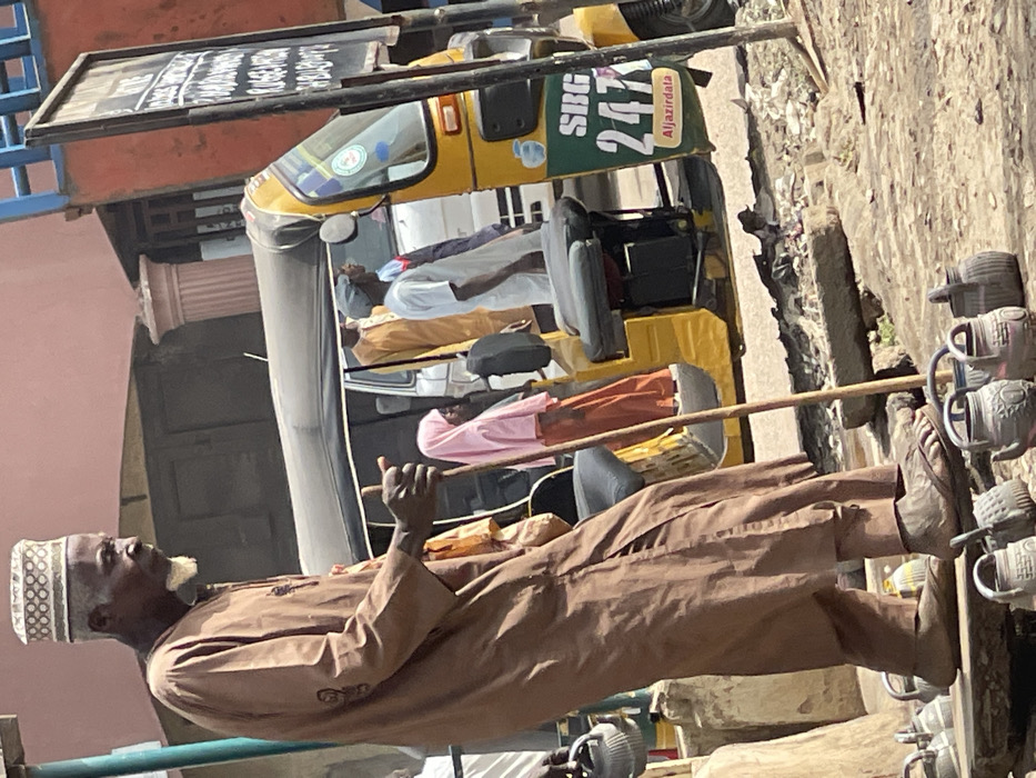 An elderly man stands in profile on a raised concrete surface in a street market in Zaria, Nigeria