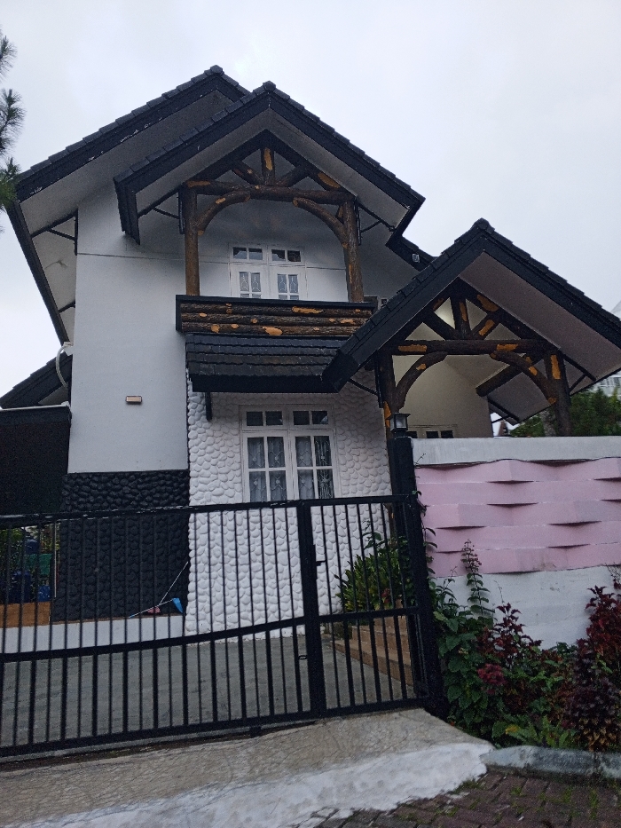 The image displays a two-story residential building located in Weintiapa, Liberia, under an overcast sky. The structure features a white upper facade and a ground floor with a lower section of dark, textured stone-like siding, transitioning to white pebbledash above. Multiple steeply pitched roofs, dark gray with exposed white undersides, adorn the building. A first-floor balcony with a horizontal log railing is prominent, supported by a framework of arching, rough-hewn wooden logs. A white-framed, multi-pane window is set back behind this balcony. Directly below, a similar log-supported canopy covers a corresponding white-framed, multi-pane ground-floor window. An additional dark-shingled canopy, also supported by wooden logs, shelters an entry on the right side of the structure. A rectangular light fixture is affixed to the white wall of the upper story, left of the balcony. A black metal gate, composed of vertical bars, secures the property in the foreground. To the right of the gate, a white perimeter wall is topped with a light pink section exhibiting a repetitive, sculpted wave pattern. Green and reddish-brown vegetation grows at the base of this wall and behind the gate. The immediate foreground shows a concrete curb fronting a paved surface. No individuals are visible within the scene.