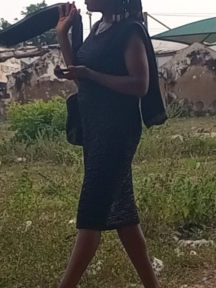 An adult female is depicted walking from left to right across an overgrown outdoor area in Adankolo, Nigeria. She wears a dark, textured, sleeveless knee-length dress, a dark fabric draped over her left shoulder, a necklace, and light-colored, cylindrical earrings. A dark handbag is slung over her left shoulder. Her left hand holds a dark object, possibly a smartphone, at waist level, while her right hand is raised near her face with fingers spread. The ground is covered in dense, wild light green and yellowish-green vegetation. In the background, dilapidated structures with light-colored, crumbling plaster and exposed dark foundations are visible, one featuring faint white markings. A green canopy structure is partially visible further in the background, beneath an overcast sky.