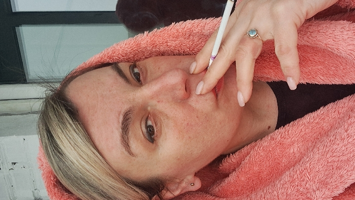 A female individual is depicted in a close-up, chest-up shot. Her light blonde hair is partially visible, styled away from her face, which has fair skin, dark eyes with eyeliner, and visible pores. A small gold stud earring is present in her left earlobe. She wears a pink, textured robe over a dark-colored garment. Her left hand, with light beige manicured fingernails, holds a white cigarette with a purple band to her mouth. An ornate gold-toned ring with an oval light blue stone is on the fourth finger of her left hand. The individual is looking directly at the camera. The background consists of a light-colored, possibly textured or painted brick wall section on the upper left, and a dark-framed window or door with a light-colored pane on the upper right. A dark, blurred, indistinct shape is visible through or reflected in the glass on the right. The scene is located in the city of Меткомелино, Russia.