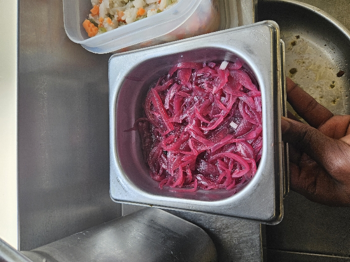 - "The image displays a dark-skinned human hand holding a stainless steel food pan filled with vibrant magenta pickled red onions" by FM-yfXT73, licensed under CC BY 4.0
