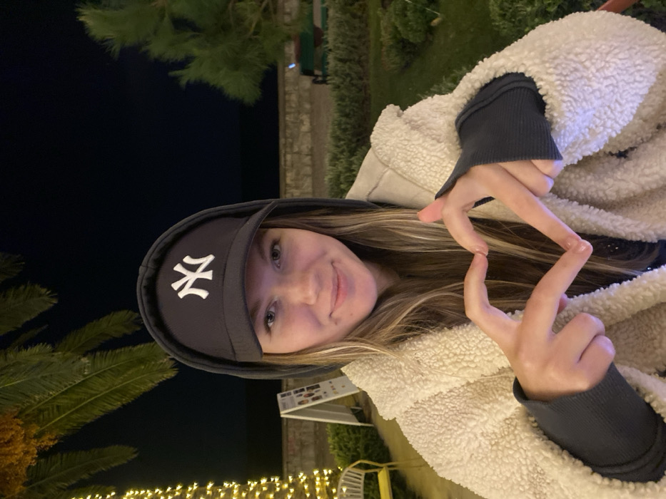 A female individual is depicted outdoors at night in Rafailovići, Montenegro. She is positioned centrally, facing the camera with a slight smile and her head tilted slightly to the right. Her hair is long, light brown, and falls over her shoulders. She wears a dark baseball cap with a white "NY" logo, a dark hooded sweatshirt, and a light-colored, possibly cream or beige, textured sherpa-style jacket. Her hands are brought together at chest level, forming a heart shape with her fingers. The background, illuminated by ambient light, shows an outdoor setting. To the left, a palm tree trunk is wrapped with warm white string lights, and the lower fronds of the palm are visible. A yellow wireframe chair is partially visible behind her left shoulder. Further back, a white A-frame sign with dark text or images is present. A low, light-colored stone wall runs horizontally across the mid-ground. Beyond the wall, green shrubbery and a darker, taller coniferous tree are visible. A park bench, appearing green with a red accent, is situated behind the foliage on the right side. The sky is dark, indicating nighttime conditions.