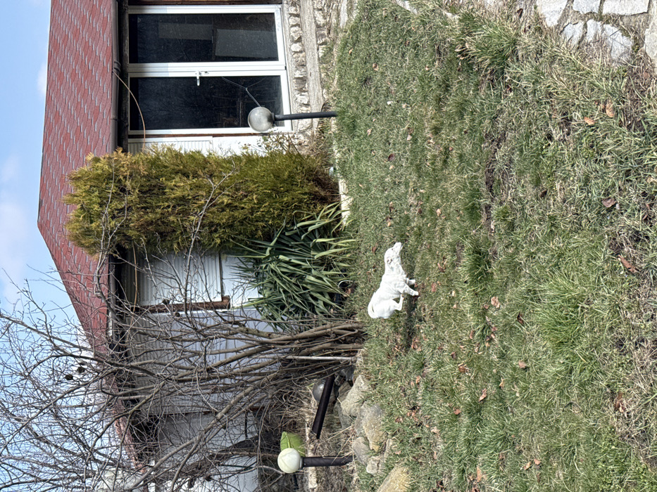An outdoor scene in Galabovtsi, Bulgaria, depicts a residential area under a bright sky. In the foreground and midground, a green grass lawn, sparsely populated with dry leaves and soil patches, occupies the lower half of the frame. A white lamb figurine, appearing to be in motion with its left front leg raised, is positioned on the grass towards the left-center. In the background, a white-sided building with a red shingled roof is visible. The right section of this building features a double-door entrance with white frames and dark glass panels. To the left of these doors, a tall, narrow evergreen conifer stands prominently. Further to the left, a large deciduous bush or small tree with numerous bare branches is positioned in front of the building. Green foliage, including yucca-like plants, grows at the base of the building between the conifer and the bare tree. Two spherical globe lights on dark posts are present: one on the far left of the midground, near several rocks, and another closer to the building, to the right of the bare tree. A dark, elongated object rests on the ground near the left globe light. A small green bucket is partially visible behind the bare tree on the far left. The far right edge of the frame shows a partial stone path or border. No human subjects are present.