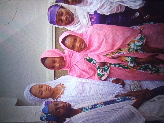 Five young women are pictured indoors, dressed in traditional Muslim clothing