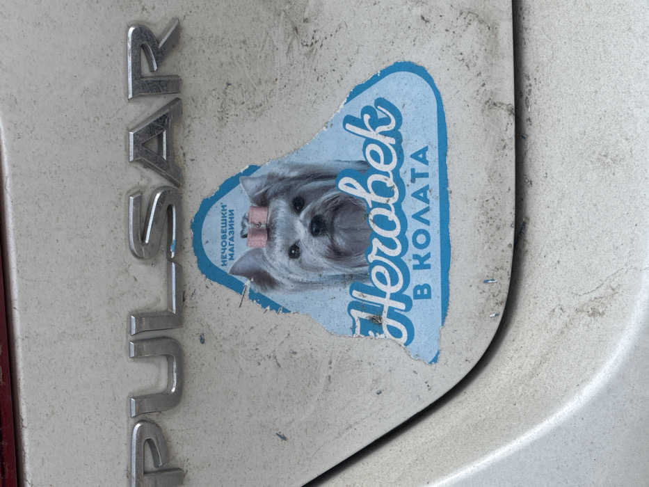 The image displays a close-up of a light-colored vehicle's exterior surface, specifically a section of a trunk or bumper, observed in Sofia, Bulgaria. Affixed to the upper part of this surface are the raised, chrome letters forming the word "PULSAR". Below and to the right of this emblem, a worn, roughly triangular adhesive sticker is present. The sticker features a light blue background and a frontal portrait of a long-haired, light-grey dog, consistent with a Yorkshire Terrier breed, which is wearing a small pink bow on its head. Above the dog's image, white Cyrillic text reads "НЕЧОВЕШКИ МАГАЗИНИ" (NECHOVESHKI MAGAZINI), which translates to "Non-human Shops." Below the dog, in a larger, stylized white cursive Cyrillic script, is the word "Човек" (CHOVEK), translating to "Human." Immediately beneath this, in smaller white Cyrillic text, is "В КОЛАТА" (V KOLATA), translating to "In the Car." The sticker shows signs of wear, including torn and frayed edges, and minor discoloration. The vehicle's surface is noticeably dirty, coated with an uneven layer of fine dust and grime. No individuals are visible in the scene.