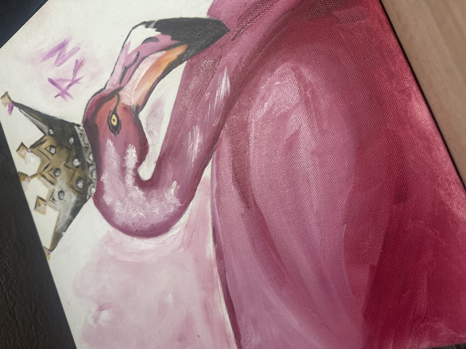 Presented in Kalipetrovo, Bulgaria, this image depicts an angled, close-up view of a painted canvas. The artwork features a stylized flamingo rendered in various shades of pink and magenta, with its head and neck oriented towards the right. A multi-pointed crown, colored gold and grey with light-colored embellishments, is positioned on the flamingo's head. The flamingo's eye is yellow, and its beak transitions from orange and pink to black at the tip. The background of the painting consists of a light pink wash, with the faded purple initials "KN" visible in the upper right corner. The canvas material's weave texture is discernible across the painted surface. The canvas rests upon a dark, unidentifiable surface, with a section of a lighter, possibly wooden, surface visible beneath the canvas's lower right edge.