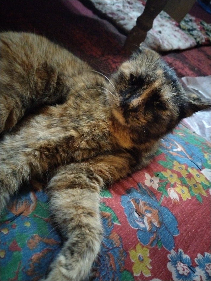 In Toptik-Saray, Uzbekistan, a tortoiseshell domestic cat is observed resting indoors. The cat, exhibiting a coat pattern of black, brown, and orange/ginger, lies on its left side with its body extended. Its head is oriented slightly towards the viewer, with eyes partially closed, indicating a state of rest or sleep. White whiskers are visible protruding from its muzzle. The animal is positioned on a patterned textile, likely a blanket or quilt, which features a reddish-brown base adorned with floral motifs in blue, yellow, green, and white. In the upper right background, a dark, slender object, consistent with a furniture leg, rests on a lighter-colored textile. Adjacent to the cat's head on the right, a crumpled, semi-transparent plastic material is present on the patterned textile. No other living beings are visible.