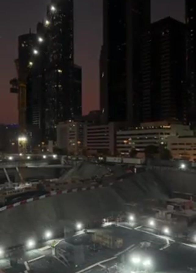 construction site at night. There are several tall buildings in the background, some of which have lights on. A yellow crane is visible on the left side of the frame. The construction site itself is lit up with bright floodlights. There are large excavated areas and what appear to be the beginnings of foundation structures. The sky is a dark pinkish-purple, indicating either sunrise or sunset. There's minimal visible activity on the construction site.