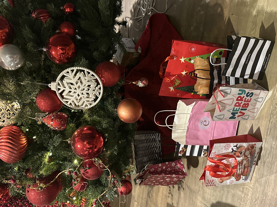 A Christmas tree decorated with red and silver ornaments dominates the left side of the image. To the right, various gift bags are arranged on a wooden surface, including a red one with Christmas trees, a striped Sephora bag, a pink bag with a lowercase "e", and others with festive designs like reindeer and the words "Merry Vibes." A dark red blanket is draped behind the bags, and a woven basket is partially visible. Some electrical wires are also visible in the background.