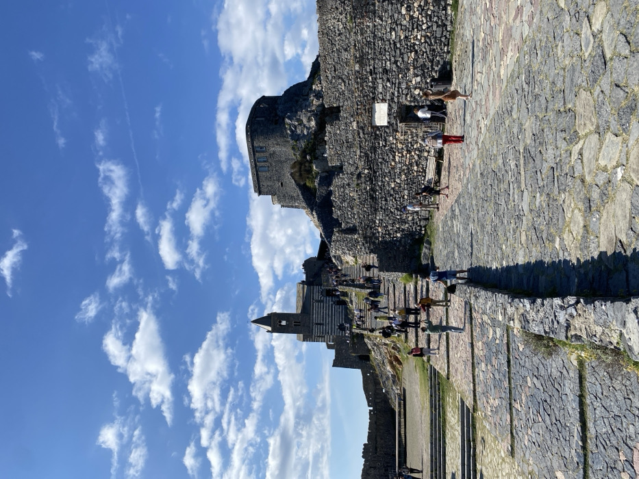 This image depicts a panoramic view of the fortified hillside in Portovenere, Italy, under a bright blue sky with scattered white cumulus clouds. The scene is dominated by historical stone architecture and active pedestrian movement. In the mid-ground, the Church of San Pietro is prominently positioned on a rocky promontory. It features a distinctive Gothic architectural style with alternating horizontal bands of dark and light stone, and a square bell tower with a conical spire. A wide, ascending stone staircase, paved with irregular dark gray stones, leads towards the church entrance. Approximately 20-30 individuals, casually dressed, are observed walking up and down these steps. To the right and at a higher elevation than the church, the Doria Castle, a robust, dark gray stone fortress, is visible on a rugged, rocky outcrop. Its thick walls and a rounded section with small windows are evident, indicating its defensive purpose. The foreground consists of a large, irregularly paved stone plaza or pathway. To the right, a substantial dark gray stone wall, part of the castle complex, features a small arched doorway with a light-colored informational plaque mounted above it. Approximately 10-15 individuals are dispersed across this plaza. One person in a light brown dress walks leftward, while another in red pants stands near a wooden bench. A person in a blue shirt and shorts stands near a low stone retaining wall on the left side of the paved area. The scene is well-lit by direct sunlight, casting clear shadows, suggesting a mid-day or afternoon time. All major structures are constructed from stone. The environment is an open public space, experiencing moderate foot traffic from visitors.