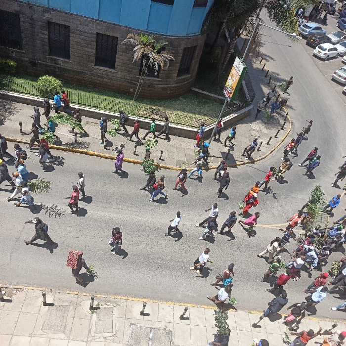 An overhead view captures an urban street scene in Nairobi, Kenya, specifically at the intersection near the Kenya National Archives building on Moi Avenue. Approximately 60-70 individuals, primarily adults of varying ages, are observed occupying the asphalt roadway. A significant portion of these individuals are carrying green tree branches or foliage. The crowd exhibits dynamic movement, with participants walking, jogging, and running in various directions, generally progressing from the upper left and central portions of the road towards the lower right. To the upper left, the multi-story Kenya National Archives building is prominent, featuring a stone lower facade and a distinctive light blue upper section, bordered by a green fence and sparse vegetation, including palm trees. A paved sidewalk runs along the bottom and left edges of the frame. Several street poles are visible along the curb lines. Parked automobiles are present on a curved side street in the upper right quadrant. The scene is brightly illuminated by direct sunlight, casting distinct shadows of individuals and objects onto the pavement.
