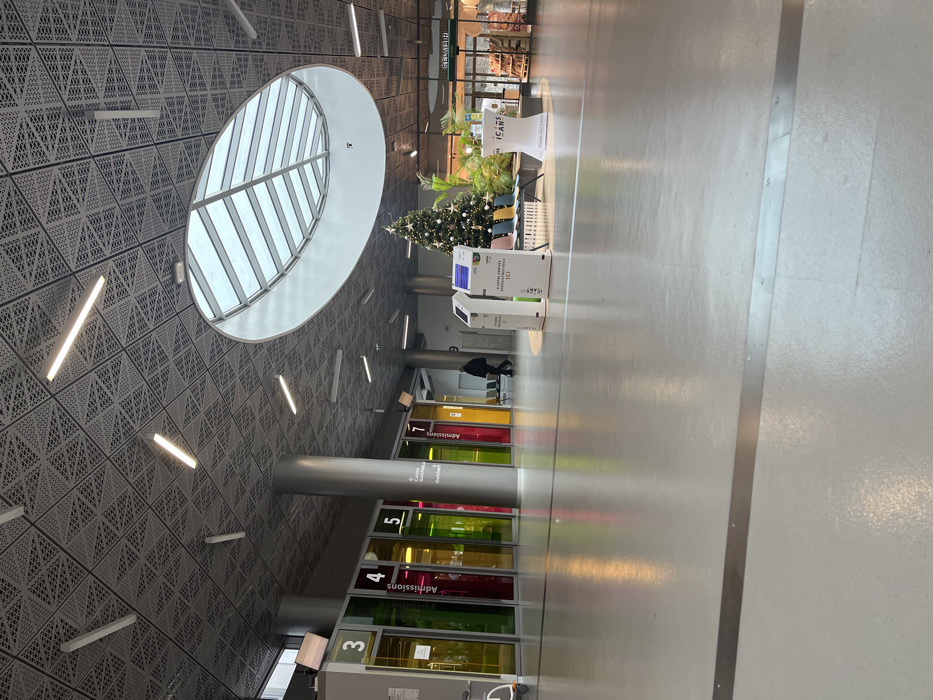 The image displays a wide view of a modern indoor public concourse, identified as the main hall of the Strasbourg-Ville train station in Strasbourg, France. The ceiling is composed of grey perforated panels with a geometric mesh pattern, interspersed with numerous linear fluorescent light fixtures. A large, oval-shaped skylight with a segmented glass structure is prominent in the upper right quadrant, admitting natural light. The floor is a reflective, light grey, possibly polished concrete or linoleum, with a thin metal strip embedded horizontally in the foreground. Along the left wall, a series of seven distinct, vertically oriented service booths or counters are visible. Each booth is enclosed with colorful glass panels: yellow for booth 3, dark green for booth 4, red for booth 5, and yellow for booth 7, with intervening booths in pink, green, and orange. Labels such as "Admissions" and "Caisse Guichets" are discernible on some. A single adult individual, dressed in a dark coat, walks from left to right in the mid-ground, passing behind one of the large, circular grey support columns. In the central mid-ground, a decorated Christmas tree with white lights and ornaments stands as a focal point. Adjacent to the tree are two tall, white, rectangular digital information kiosks, one displaying text including "ICI". To the right of these, a cluster of potted green plants surrounds another white display stand featuring the "ICAN" logo. Behind these elements, yellow and blue public seating benches are visible. In the far background, on the right side, a retail or service storefront with partial lettering "SELATSI" is present.