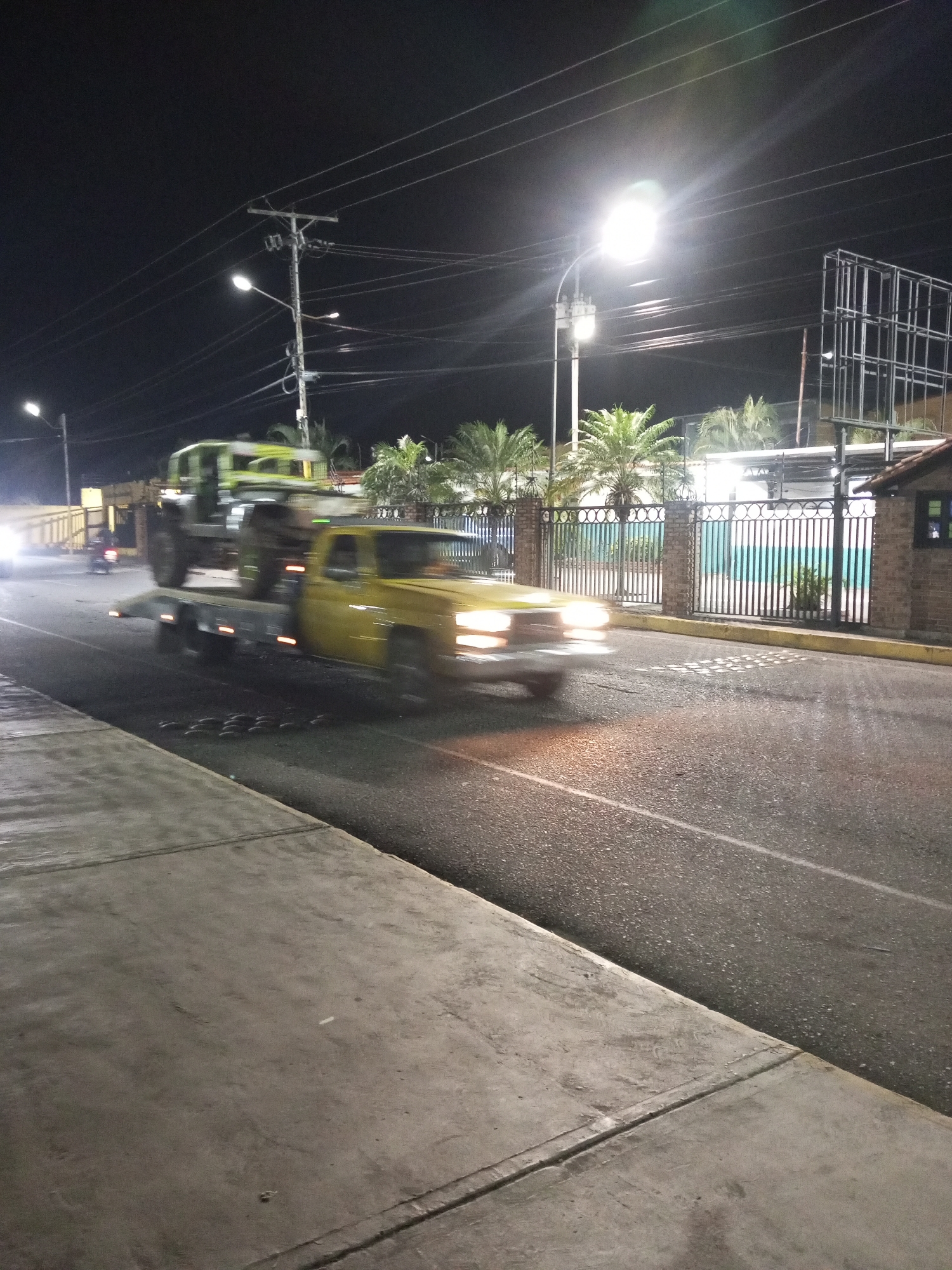 The photograph, taken at night in Tinaquillo, Venezuela, shows a yellow tow truck carrying a green jeep on a flatbed trailer moving along a street