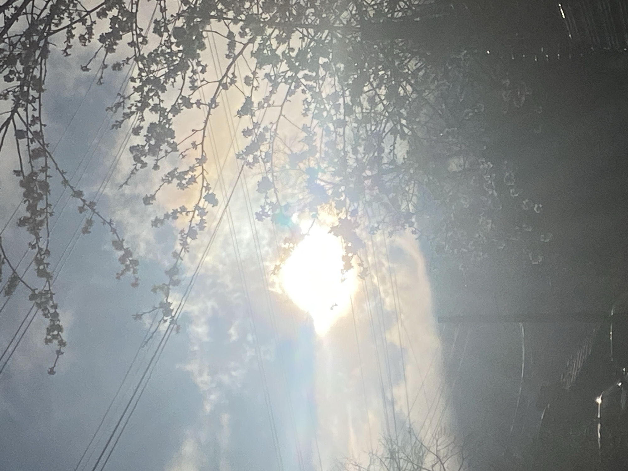 The image depicts an outdoor scene in Vlado Trichkov, Bulgaria, characterized by strong backlighting from a low sun. The upper portion of the frame shows a partially cloudy sky with patches of blue. A highly overexposed, bright sun is positioned in the upper-middle left, generating significant lens flare and atmospheric haze that obscures details, particularly in the lower-right quadrant. Multiple parallel utility wires traverse horizontally across the sky. In the right half of the image, the silhouetted branches of a deciduous tree, likely in early bloom with numerous small, light-colored buds or flowers, are prominent. Denser, darker foliage, consistent with trees and bushes, occupies the lower and central foreground. A dark, vertical utility pole is faintly visible in the lower-middle portion of the image, partially obscured by the haze and vegetation. Indistinct, dark shapes consistent with the roofs of parked vehicles are visible in the lower-left corner. No human figures or discernible actions are present.