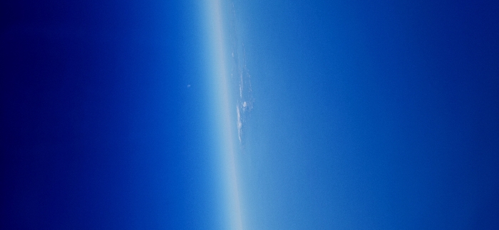 A vibrant gradient of blue dominates the image, transitioning from a deep, saturated hue on the left to a lighter, more cyan shade on the right. A distinct, pale band bisects the frame diagonally, suggesting the curvature of the Earth and its atmosphere. Wispy white clouds punctuate this band, adding a subtle texture against the smooth gradient. The overall effect is a serene and abstract depiction of the planet from space.