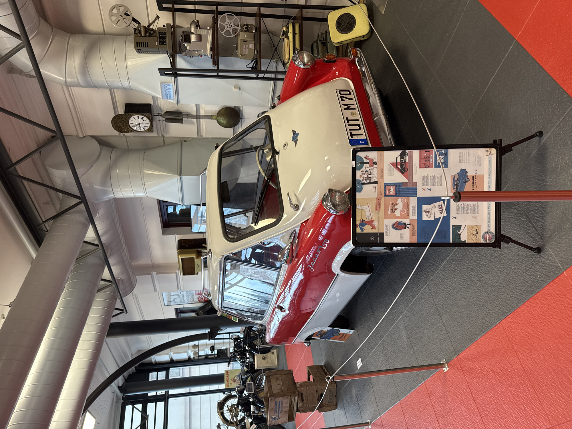 The scene depicts an interior view of a museum exhibit, specifically in Sigmaringen, Germany, likely at the Zoller-Hof premises, as indicated by labels on items within the exhibit. The central subject is a vintage, two-tone microcar, a Zündapp Janus 250, with a red lower body and white upper body, roof, and front hood. The car features prominent rounded headlights, a chrome front bumper, a small blue emblem on the hood, and a German license plate reading "TUT M 70". A chrome roof rack is mounted on the vehicle's roof. The car is situated on a dark gray textured floor and is separated from the viewer by a white rope barrier supported by chrome stanchions. To the left of this barrier, the floor transitions to a textured red surface. Directly in front of the car, a black easel-style display stand holds a poster featuring multiple graphic panels and text, providing information about the Zündapp Janus 250 and explicitly mentioning "Zoller-Hof, Sigmaringen." In the background, to the right of the car, a black multi-tiered metal shelving unit displays an assortment of vintage media equipment, including several film projectors, film reels, and a yellow portable record player. Above this, an antique wall clock with a pendulum is mounted, positioned between large, white industrial-style ventilation ducts that traverse the ceiling and walls. An "AUDIO GUIDE" sign is visible near the clock. To the left of the main subject, several vintage motorcycles are partially visible further back in the exhibition space. In the mid-ground on the left, three stacked wooden crates are present, with labels indicating "Zoller-Bräu Sigmaringen" and "Fanta." The far background on the left reveals large windows with dark frames and dark structural columns, suggesting an expansive indoor area. No individuals are present in the depicted scene.