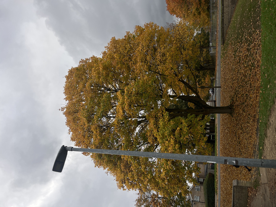 The image depicts an autumn scene in a residential or suburban area of Stevenage, United Kingdom, under an overcast sky