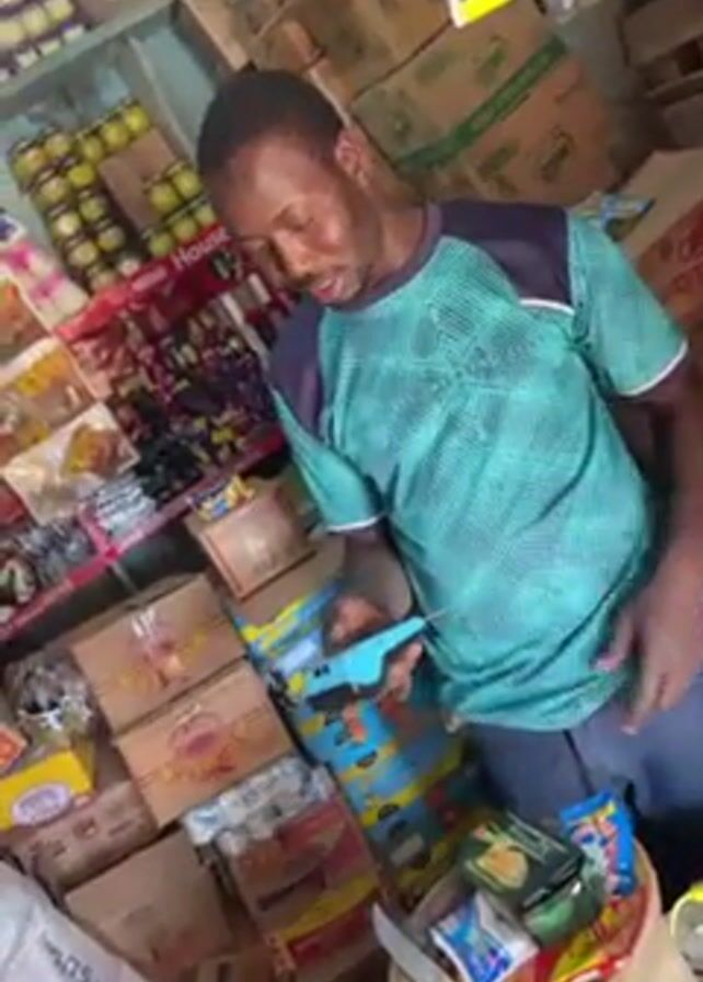 A man is standing in a small store. He's holding a small device in his hands, possibly a card reader. The store is packed with goods on shelves and in boxes. The man is wearing a green and blue shirt and gray pants. The store seems to be a typical neighborhood shop.