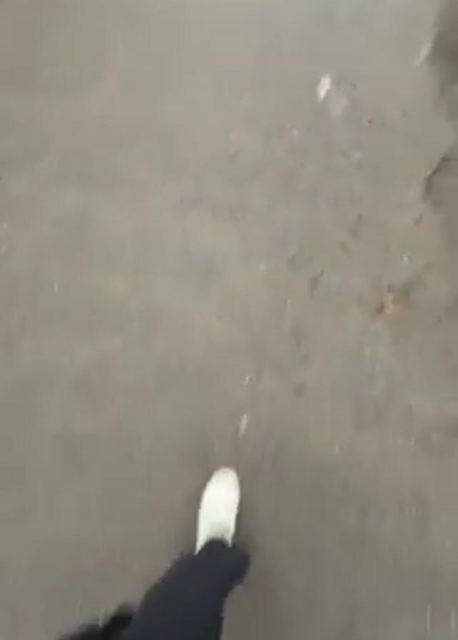 The video opens with a close-up view of a person walking on a gray sidewalk