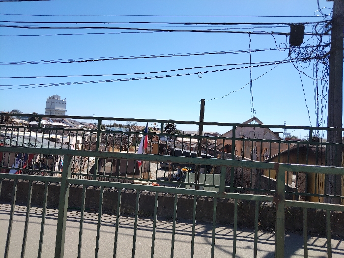 A streetscape is viewed through a green metal fence. Beyond the fence is a dense area of buildings and structures, some appearing makeshift, under a clear blue sky. A taller, white, multi-story building is visible in the distance. Power lines crisscross above. A utility pole is on the right side. The scene conveys a sense of urban density and varied architecture.